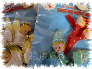 My Vintage Christmas Monday items are sooooo cute! My good friend found these for me, knowing that I am on the hunt for vintage christmas items. These cute little christmas decorations have pipe cleaners attached to the back of their little heads to tie unto a gift or package! Sweet huh? The packages still have their 49 cents tag...when was the last time you could buy something this cute for 49 cents? Please don't forget to visit Joan at Anything Goes Here and see what other Christmas goodies her elves have posted........Enjoy and Merry Christmas.